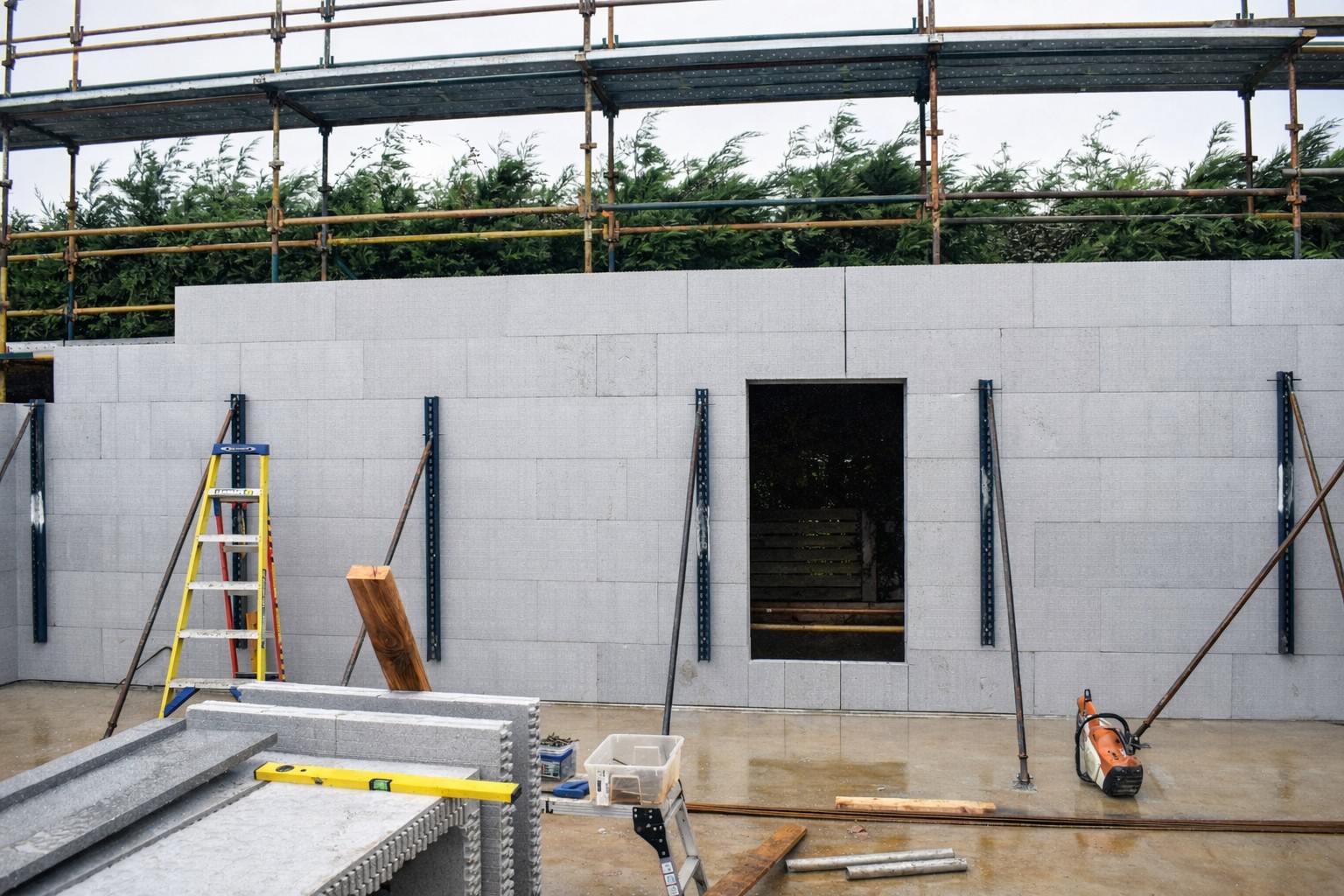 Once the forms are in place, the structure is propped and aligned. Standard ICF bracing and alignment equipment is used to stabilise the wall, allow fine adjustment and maintain straight lines through the height of the formwork. This stage includes checks on dimensions, plumb, level and set-out before the concrete pour begins.
